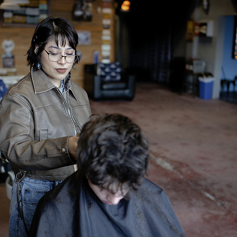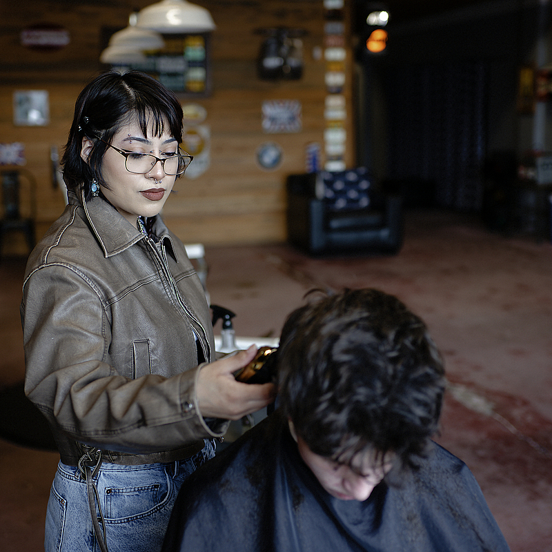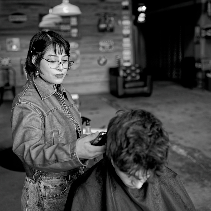 The rendering here is classic and punchy. Even in the barbershop, with various light sources, mirrors, and a mix of textures, the Nokton manages the transitions beautifully. The shadow detail in the barber's jacket and the highlights on the frames are well balanced, providing a rich tonal range that feels timeless. Did I say I love B&W?