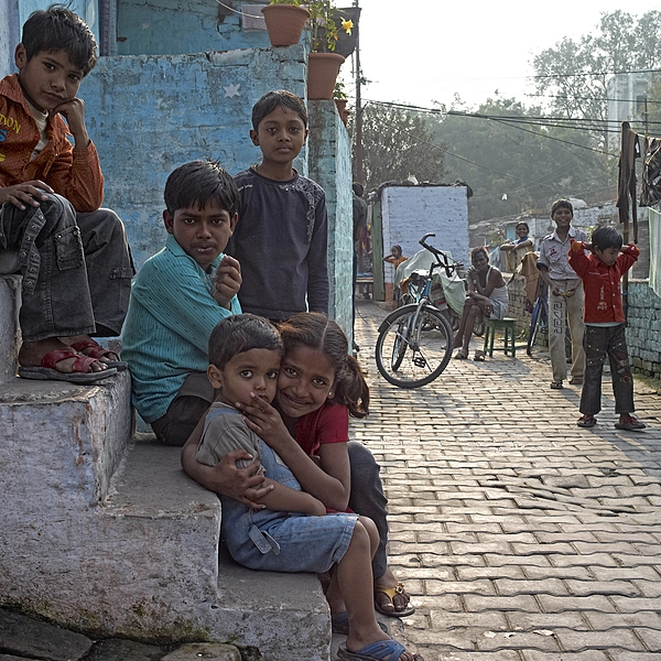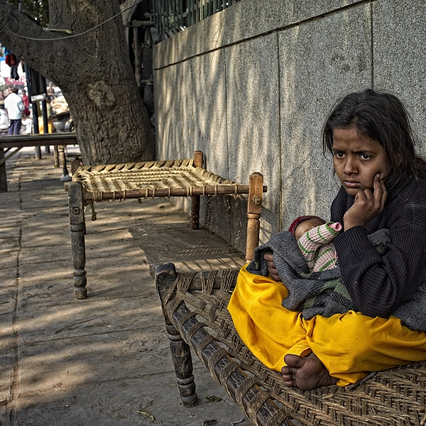 Young girl takes care of her young brother Delhi