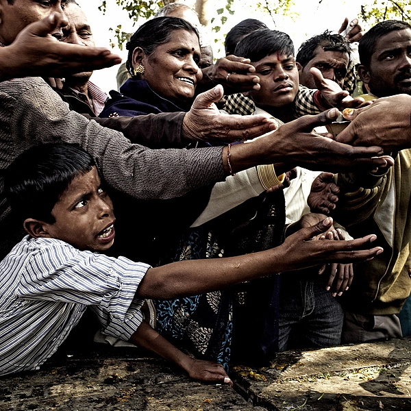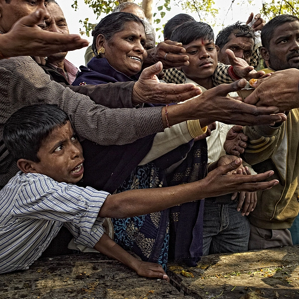 Young boy fighting for a free handout