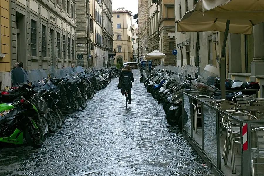 Lone Cyclist In a street full of Motorcycles