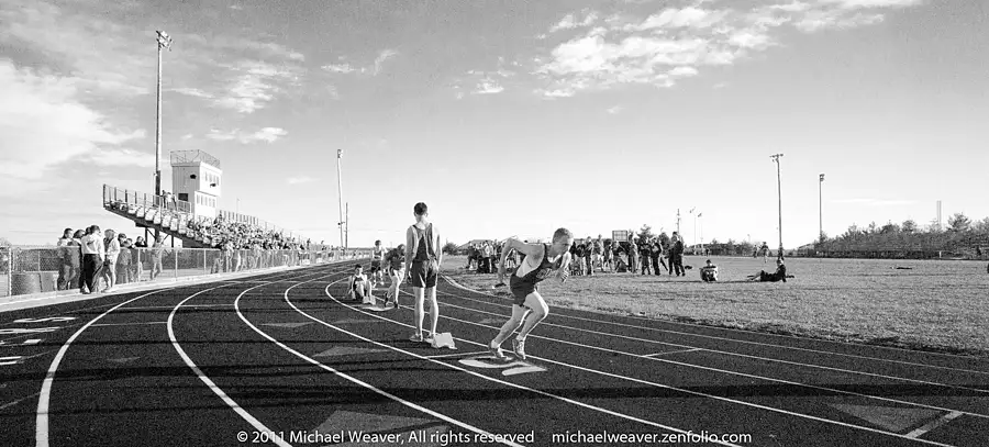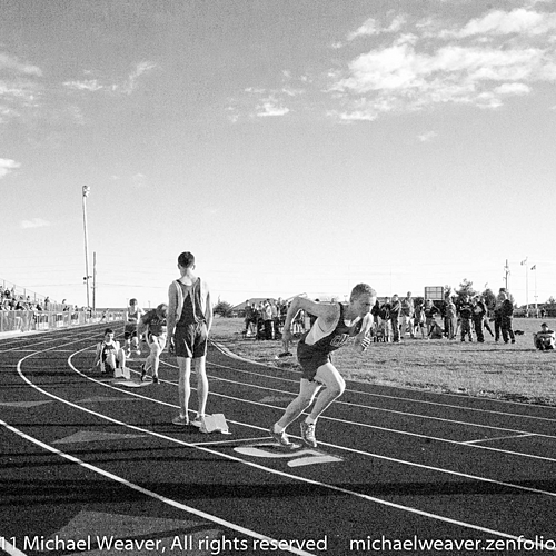 (Jerseyville, IL) Runners are coming off the starting blocks for a race at a spring track event at the Snyder sports complex. The look of the image reminded me of something from the 1930's.