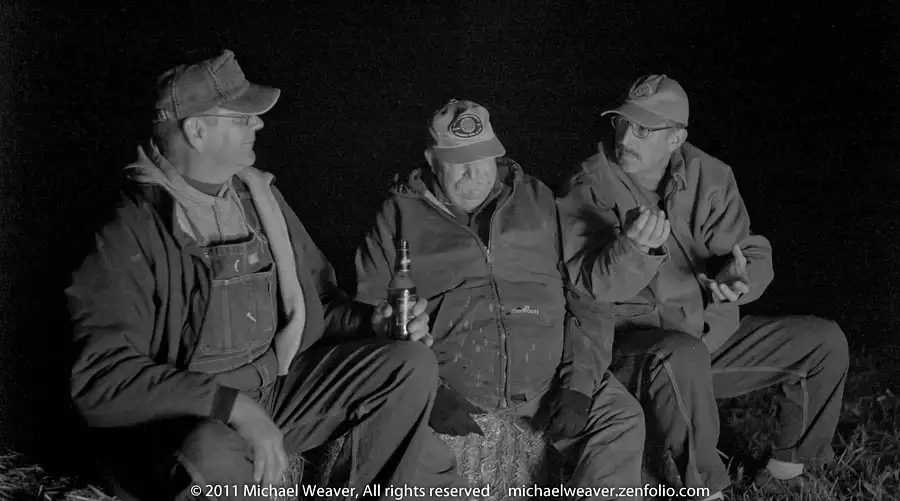 (Brighton, IL USA) Three friends sit on a bale of straw during an annual fall bonfire and hayride. Many rural US residents host annual outdoor fall parties that generally include a large outdoor fire, some sort of food that can be cooked over the fire, beer and a ride on a straw filled farm wagon pulled by a tractor Sometimes partygoers in the wagon will stop at rural mailboxes and fill them full of straw from the wagon. L to R Bill Huebener, Bob Sancamper, Art Tunnicliff.