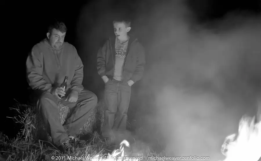 (Brighton, IL USA) A boy and his dad warm themselves near a fire surrounded by bales of straw. In rural areas of the US, people host annual outdoor parties that include a roaring fire, some sort of food that can be cooked over the fire and drinks of some kind. There is also a wagon lined with straw pulled by a farm tractor that takes partygoers on the gravel backroads. This boy and his dad arrived early and were trap shooting at clay shotgun targets before darkness fell.