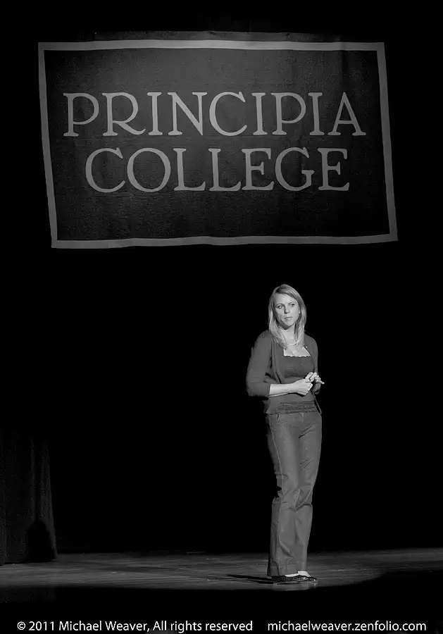 (Elsah, IL USA) CBS foreign correspondent Lara Logan onstage as part of the Principia College Speaker Series. Logan was the 2011 Ernie and Lucha Vogel Moral Courage speaker. On the night of Feb. 11, 2011, as the dictatorship of Hosni Mubarak was falling, Logan joined the more than 100,000 people celebrating in Tahrir Square, where a mob turned on her and sexually assaulted her. She now speaks out to help end the code of silence surrounding sex assaults on female journalists as well as others.
