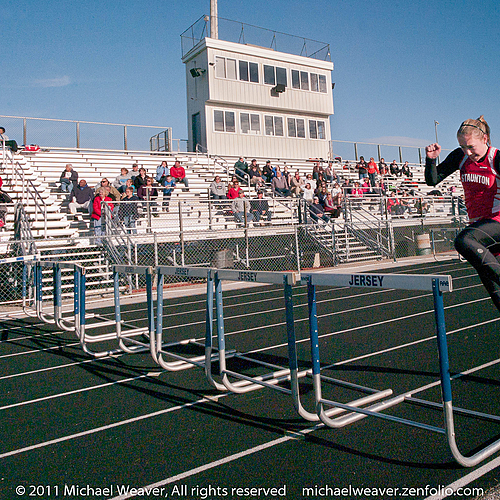(Jerseyville, IL) A member of the Staunton Bulldog track team starts to jump a hurdle at a spring 2011 co-ed track meet at the Snyder sports complex. I was so close to the track I could have reached out and touched her as she jumped.
