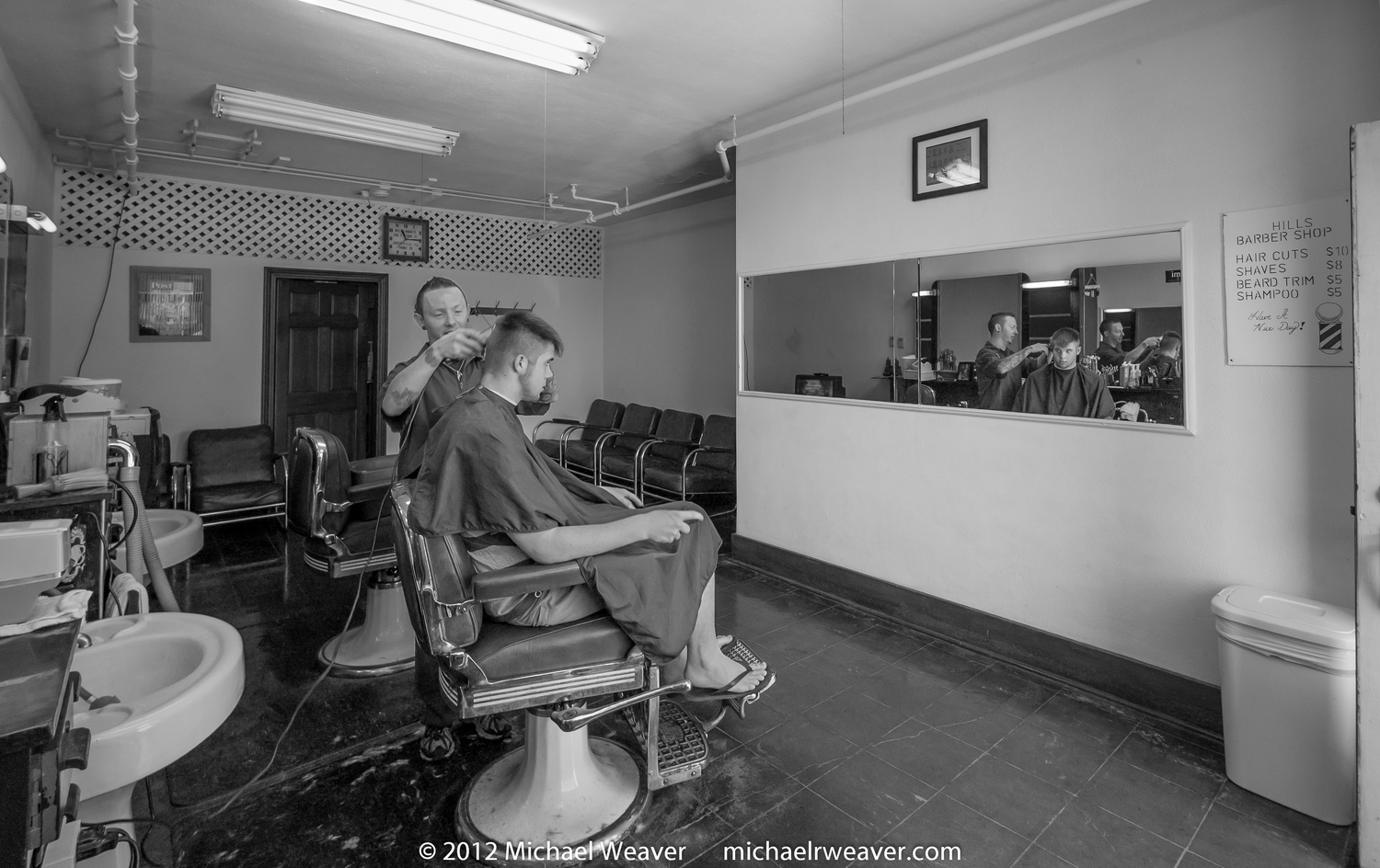 (Jerseyville, IL) Barber Jimi Hill cuts the hair of Alex Weaver at 11:15 AM on the Monday morning following Alex's high school graduation. Jimi previously worked in the shop of Elmer Heafner which is located two blocks away. Jimi is only the third barber in the location since the early 1930's. The leather covered seating and art deco fixtures date from that period. His shop is lit by plate glass windows and a door facing east with some fluorescent lamps above the stations and the ceiling.