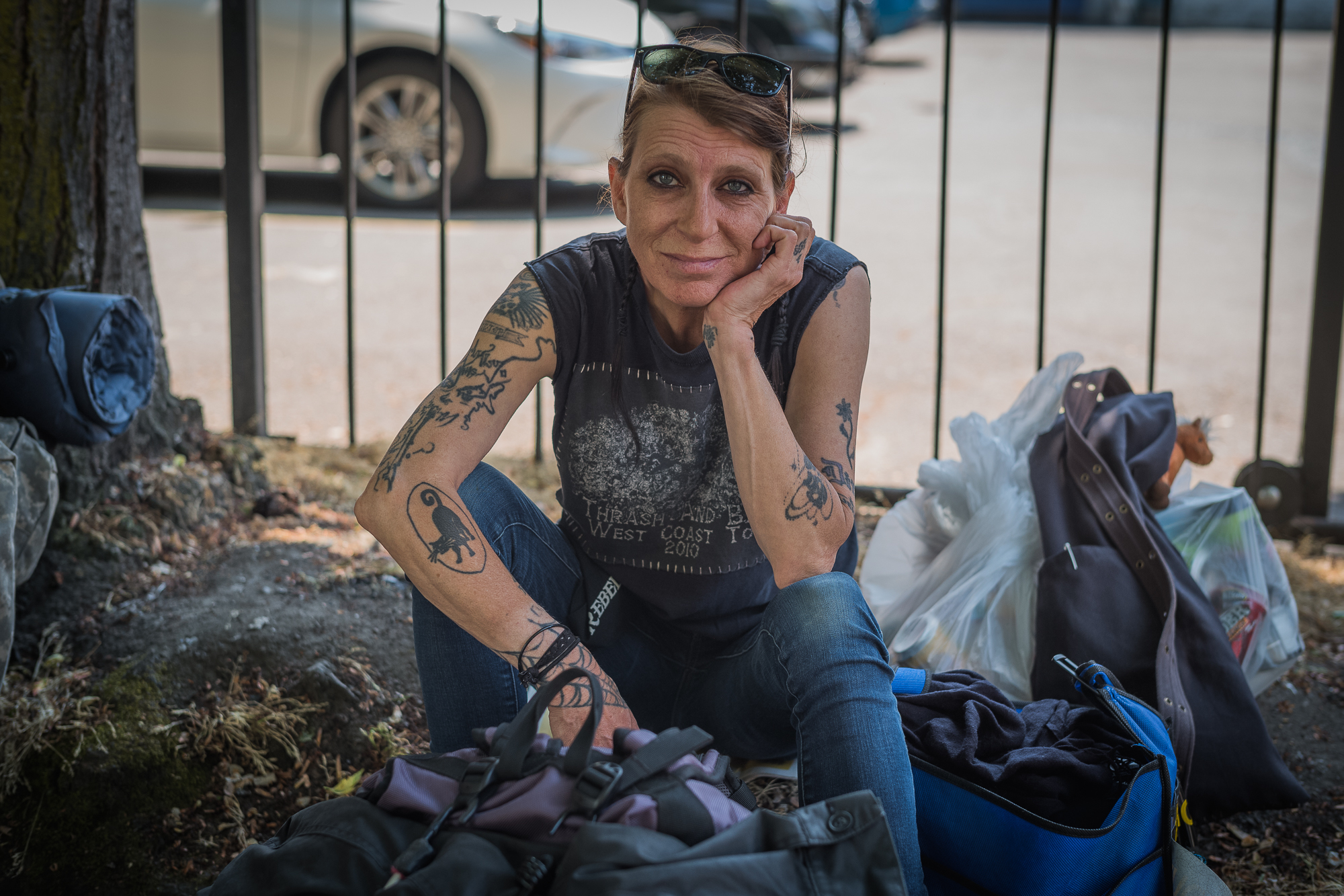 A friendly woman seated outdoors on the ground, with a genuinely warm smile directed toward the camera. Her arms are covered in various unique tattoos, and she is wearing a dark, worn t shirt and blue jeans, with sunglasses resting on top of her head. Surrounded by her visible belongings, the portrait captures a moment of resilience and composure amidst the urban environment.