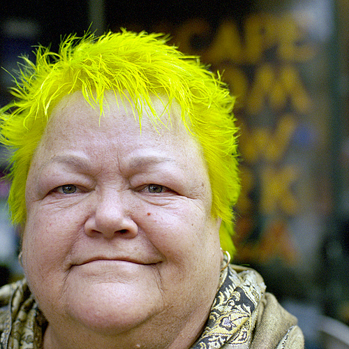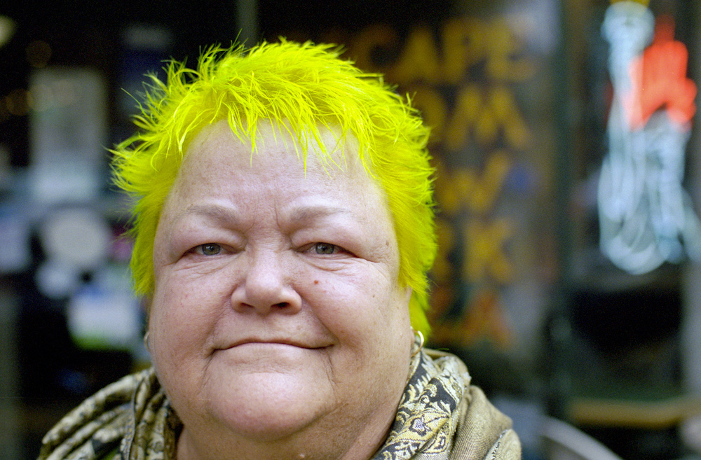 This one is a departure from the previous black and white photos, centers on a person with boldly dyed, spiky neon yellow hair, which instantly dominates the frame and epitomizes Portland's creative eccentricity. The subject's expression is one of calm, direct confidence, with gentle, expressive lines around the eyes suggesting warmth and experience. The face is photographed in sharp focus, contrasting with the soft, indistinct background. Again, choice of shooting at a fast aperature. The subject is bundled in a printed, soft looking scarf and a collared shirt, suggesting an individual style where comfort and radical color choices coexist seamlessly.